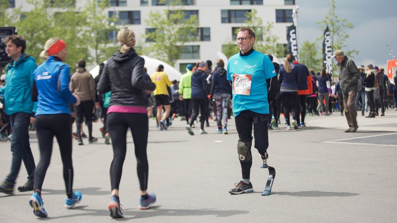The weather forecast wasn’t great for Sunday: snow and rain – in May! But Norbert Strittmatter didn’t mind. He was looking forward to the charity run in Zug. For a long time he didn’t know whether he would ever be able to run again. He lost the lower half of his left leg in a serious motorbike accident. He spent many days in hospital, followed by rehabilitation. “Three things happened that could have killed me. So, there was a stroke of luck to my misfortune,” he says.